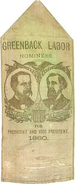 The Greenback Party was a newcomer to politics in 1880, having first nominated candidates for national office four years earlier.[1] The party had arisen, mostly in the West and South, as a response to the economic depression that followed the Panic of 1873.[2] During the Civil War, Congress had authorized "greenbacks", a new form of fiat money that was redeemable not in gold but in government bonds.[3] The greenbacks had helped to finance the war when the government's gold supply did not keep pace with the expanding costs of maintaining the armies. When the crisis had passed, many in both the Democratic and Republican parties, especially in the East, wanted to return the nation's currency to a gold standard as soon as possible (candidates who favored the gold-backed currency were called "hard money" supporters, while the policy of encouraging inflation was known as "soft money").[4] The Specie Payment Resumption Act, passed in 1875, ordered that greenbacks be gradually withdrawn and replaced with a gold-backed currency, beginning in 1879.[5] At the same time, economic depression had made it more expensive for debtors to pay debts they had contracted when the currency was less valuable.[6] Neither the Democrats nor the Republicans offered a home to those who favored retaining greenbacks, so many looked to create a third party that would address their concerns.[7] Greenbackers drew support from the growing labor movement in the nation's Eastern cities, as well as from Western and Southern farmers who had been harmed by deflation.[8] Beyond their support for a larger money supply, they also favored an eight-hour work day, safety regulations in factories, and an end to child labor.[9] As one author put it, they "anticipated by almost fifty years the progressive legislation of the first quarter of the twentieth century".[9]