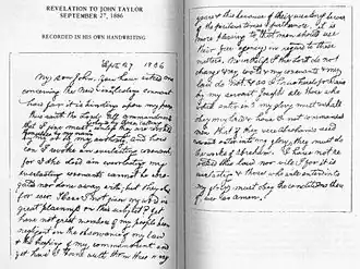 In the Mormon fundamentalist movement, the 1886 Revelation is the text of a revelation received by John Taylor, third President of the Church of Jesus Christ of Latter-day Saints (LDS Church), on 27 September 1886,[1] which restated the permanence of the principle of plural marriage. Along with Joseph Smith's 1843 revelation on plural marriage,[2] the 1886 revelation is one of the primary documents used by Mormon fundamentalists to justify their continued practice of polygamy.