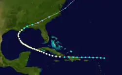 The bark Florence, stationed at Barbados on July 20, recorded squally weather and decreasing barometric pressures.[23] Consequently, the track for this system begins on that day about 150 mi (240 km) southeast of the island. Later on July 20, the cyclone entered the Caribbean after passing through Saint Vincent and the Grenadines. Intensifying into a hurricane early the next day, the storm reached Category 2 status on the modern-day Saffir–Simpson scale on July 22. After moving west-northwestward for its duration thus far, the hurricane turned northwestward over the northwestern Caribbean on July 25. The cyclone struck the northeastern Yucatán Peninsula later that day and curved northward. Weakening to a Category 1 hurricane over the Gulf of Mexico, the storm turned north-northeastward. Around 15:00 UTC on July 27, the hurricane made landfall near Fort Walton Beach, Florida, with winds of 85 mph (140 km/h), with an estimated barometric pressure of 978 mbar (28.9 inHg). The storm continued north-northeastward as a tropical storm, before dissipating late on July 28 near Atlanta, Georgia.[7] [23]