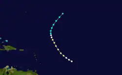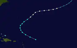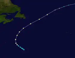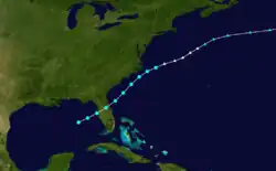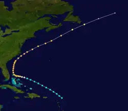 On August 14, HURDAT begins the track for this system just east of the Leeward Islands,[7] the same day that Saint Kitts reported squalls and falling barometric pressures.[5] Moving northwestward and then west-northwestward, the cyclone intensified into a hurricane by August 17. On the following day, the system passed within 40 mi (65 km) of the Abaco Islands, likely as a Category 2 hurricane. The hurricane then began curving northeastward on August 19 and intensified into a Category 3 hurricane. Sustained winds likely increased slightly to 120 mph (195 km/h) as the storm passed just offshore North Carolina on August 20,[7] based on the steamship City of San Antonio recording a barometric pressure of 967 mbar (28.6 inHg).[5][31] The hurricane continued out to sea and transitioned into an extratropical cyclone on August 22 about 250 mi (400 km) southeast of Cape Race, Newfoundland.[7]