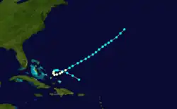 The steamship Alvena first encountered this storm on October 8, with the track beginning near Inagua in the Bahamas.[44] Because the Alvena recorded a barometric pressure of 994 mbar (29.4 inHg), the storm is estimated to have peaked with winds of 70 mph (110 km/h).[44][5] Moving north-northwestward, the cyclone passed over the eastern Bahamas before being last noted early on October 9 to the east of the Abaco Islands.[7] Chenoweth reanalysis study concluded instead that the storm moved across Hispaniola and Cuba from October 7 to October 9, when it dissipated over the latter.[6]
