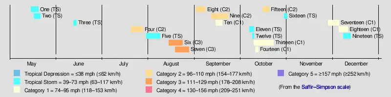 | Thirteen | October 9–20 | Category 1 hurricane | 85 (140) | 981 | Lesser Antilles, Greater Antilles (Dominican Republic and Cuba), Gulf Coast of the United States (Louisiana), Southeastern United States | >$10,000 | None | [17] | ||