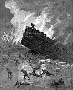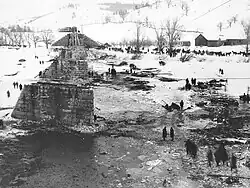 At approximately 2:10 a.m., as the train approached the West Hartford Bridge, a catastrophic failure occurred. The engine, along with the combined baggage, express, mail, and smoking cars, successfully passed over the bridge. However, the two sleepers and two passenger cars derailed. Upon reaching the bridge, they broke away from the forward portion of the train and plunged approximately 40 feet onto the ice-covered White River.[2] Many passengers were trapped inside as the wooden cars ignited from overturned coal-burning stoves and oil lamps. The bridge was also set ablaze by the burning cars.[3][4][5][6]