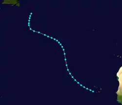 The 1924 report from Mitchell noted that this storm was first observed near the Cabo Verde Islands on September 12.[7]: 37 Initially moving northwestward, the storm curved north-northwestward two days later, but then resumed a northwestward course by September 16. The cyclone is estimated to have peaked with winds of 60 mph (95 km/h). By September 18, the system turned north-northeastward and was last noted on the following day about 290 mi (465 km) southeast of Cape Race, Newfoundland.[6] Chenoweth's study indicates that the cyclone developed as a tropical depression on September 14. An extratropical transition on September 19 has also been proposed.[5]