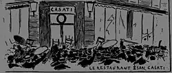 Later that evening, the Italian consulate in Lyon was attacked by the Italophobic crowd attempting to break down its gates, shouting "Down with Italy!".[10] This crowd was repelled by the gendarmes and police, before retreating to the Casati restaurant, located in Place Bellecour.[8] There, the demonstrators destroyed the storefront and burned the chairs while singing La Marseillaise. Other businesses, such as grocery stores, were also ransacked and destroyed, though the total number this night did not exceed ten.[8]