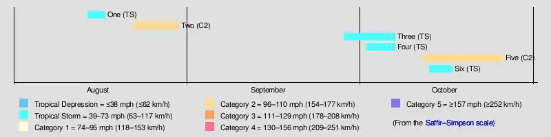 Ships detected the season's first known cyclone on August 14 over the Gulf of Mexico. Striking Louisiana and Mississippi, the storm dissipated on August 17. Later in August, the second cyclone traversed the Caribbean before striking the Yucatán Peninsula on August 27 as a hurricane and then making another landfall in Mexico in Tamaulipas on August 30. On September 28, the track for the season's third system begins in the northwestern Caribbean Sea. Remaining a tropical storm, the cyclone struck the Yucatán Peninsula, the Bahamas, and Newfoundland before dissipating on October 7. The final three known tropical cyclones developed in October, with the first and third of those storms remaining minimal tropical storms. However, the second October storm – the fifth Atlantic cyclone of the year – struck Cuba and the Bahamas and moved near or over Bermuda at hurricane intensity until transitioning into an extratropical cyclone on October 26, concluding seasonal activity.[5]
