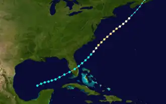 The unusually slow-moving hurricane attained its peak intensity early on October 11, with estimated maximum sustained winds of 100 mph (155 km/h). Shortly thereafter, it made its closest approach to Cape Hatteras, North Carolina, passing roughly 115 mi (185 km) to the southeast.[1] For several days, the hurricane brushed the coast from Virginia to southern New England with hurricane-force wind gusts.[3] The storm began to weaken as it slowly gained latitude. Unnseasonably cool temperatures were recorded in New York City as the system passed offshore, suggesting that it had begun losing its tropical characteristics.[3] By 00:00 UTC on October 14, the storm completed its transition into an extratropical cyclone,[1] and no winds stronger than tropical storm-force were observed north of 41°N.[4] A little over a day later, the hurricane's extratropical remnants struck the coast of central Nova Scotia before dissipating on October 16.[1]