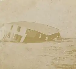 The worst effects were observed along the Northeastern shoreline from New Jersey to New England. In these areas, coastal flooding and persistent gales inflicted an estimated $500,000 in damage to beachfront property. Many small houses, seawalls, wharves, and piers were damaged or destroyed.[5][11] Wind gusts along the Jersey Shore reached 75 mph (120 km/h), which unroofed buildings and blew summer cottages off their foundations.[13] Homes and businesses in Asbury Park were bombarded by the debris from a half-mile stretch of boardwalk that was torn apart.[11] Thousands of spectators lined the shoreline there to watch the enormous waves.[13] One of the premier hotels in Sea Isle City was demolished,[11] along with numerous cottages.[13] The storm heavily flooded streets in the city and damaged yachts along the coast.[6] Just south of Sea Isle City, the steamer Spartan went ashore after her captain spent 30 hours fighting the storm at the wheel.[12] In Atlantic City, one amusement pier was heavily damaged by an impact from the dislodged wreckage of a previously sunk schooner,[14] while another was broken up by the surf.[11] Winds in Atlantic City gusted to 55 mph (90 km/h), and floodwaters surrounded some cottages, forcing residents to leave their homes by boat. The railway to Ocean City was washed out, leaving the community temporarily isolated. Railroad tracks were also submerged to the south at Cape May.[6] Farther inland, the winds brought down some few trees and overhead wires.[15] In Millville, high tides caused the Maurice River to overflow and destroy crops in bordering fields.[16]