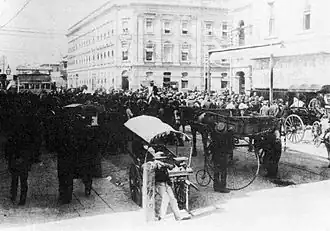 ![]() The 1896 election day crowd on Waymouth Street. The election results can be seen on display to the right. The 1896 referendum was held concurrently with the general election. | ||