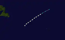 On September 3, the ship America first encountered this storm,[10] a Category 1 hurricane about 675 mi (1,085 km) southeast of Cape Race, Newfoundland.[3] The America, Ruthin, and Iddesleigh each recorded winds of 80 mph (130 km/h).[17] Later, waves waterlogged the America and eventually caused it to capsize, but the Marengo rescued the crew. The storm moved northeastward and was last encountered by the brig Iddesleigh on September 5,[10] on the same day the Atlantic hurricane best track indicated that the system transitioned into an extratropical cyclone approximately 870 mi (1,400 km) west-southwest of Ireland. The extratropical storm dissipated several hours later.[3] A reanalysis by Chenoweth, published in 2014, argued that this system was not a tropical cyclone.[5]