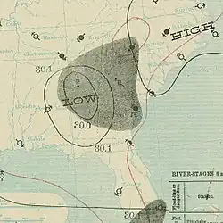 Parts of Louisiana experienced heavy rainfall. Plaquemine reported 4 in (100 mm) of precipitation in only a few hours, damaging local sugarcane crops.[22] In Lake Charles, rains flooded streets and caused losses to rice crops, while winds downed many telephone poles.[23] Similarly, the town of Jennings noted damage to rice crops, with losses totaling "many thousands", according to The Times-Democrat.[24] Farther east, New Orleans reported sustained winds up to 42 mph (68 km/h).[10] Precipitation generated by the storm in Mississippi led to a washout along the Yazoo and Mississippi Valley Railroad.[25] Elsewhere, winds and precipitation from the storm and its remnants spread across parts of the Mississippi Valley and Eastern United States.[10]