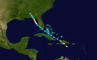 A "violent hurricane" was first observed near the south coast of Hispaniola at 12:00 UTC on July 27.[1] Within the next six hours, the storm made landfall in Azua Province, Dominican Republic with winds of 80 mph (130 km/h) – equivalent to a Category 1 hurricane on the modern-day Saffir–Simpson hurricane wind scale. Early on July 28, it weakened to tropical storm while moving northwestward across northern Haiti. A few hours later, the storm emerged into the Atlantic near Port-de-Paix. The system maintained intensity for over 24 hours as it moved northwestward and parallel to the north coast of Cuba. At 10:00 UTC on July 30, the storm made landfall in the United States at Islamorada, Florida, on Upper Matecumbe Key, with winds of 45 mph (75 km/h). It weakened slightly and then moved just offshore or struck the mainland portion of Monroe County, Florida. Early on July 31, the storm began to re-strengthen while entering the eastern Gulf of Mexico.[2]