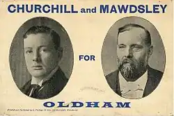 As the previous election had been close, the by-election campaign was an intense one in which the candidates addressed meetings "at breakfast time, during the dinner hour, and in the evening".[17] One of the main campaign issues was the Clerical Tithes Bill, which the Conservative-dominated government was promoting, which would give additional help to Church of England clergy and to Church schools. Oldham included many Nonconformists who were opposed to the Bill.[18] When the issue of the Bill was raised, the Liberal candidates opposed it, arguing that Parliament was not the place to discuss matters of faith. Churchill initially supported it on the basis that legislation was needed to maintain law and order.[17]