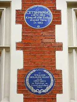 The building is Grade II listed, along with the semi-detached and mirror-image 16 Melbury Road and a later attached studio building at 18A Melbury Road.[5] It was the home and studio of the Pre-Raphaelite painter, William Holman Hunt, from 1903 until his death in 1910.[6][7] Cetshwayo kaMpande (c.1826–1884), King of the Zulus, stayed here in 1882. Both Holman Hunt (in 1923)[8] and Cetshwayo (in 2006)[9] are recorded with blue plaques by English Heritage on the front of the building, one above the other.