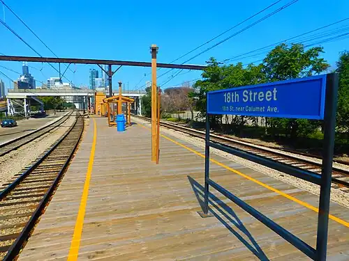 18th Street station is a commuter rail station on the Near South Side of Chicago, at 18th Street near Calumet Avenue. It serves the Metra Electric Line north to Millennium Station and south to University Park, Blue Island, and South Chicago. For many Metra Electric trains, this is a flag stop, and the train will only stop there if specifically requested by a passenger.[2] As of 2018, 18th Street is the 226th busiest of Metra's 236 non-downtown stations, with an average of 23 weekday boardings.[1]