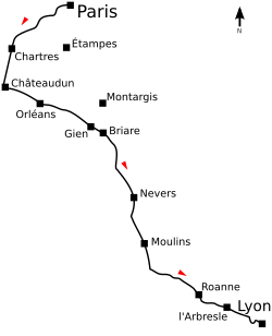 The Autocar magazine had suggested that the route should take the competitors in a straight-line, so as to minimize the chance of foreign entrants getting lost.[1] The initial route proposed by the ACF in January 1900 would take the competitors from Paris to Lyon by the most direct route, heading south through Étampes, Pithiviers, and Montargis before reaching Nevers and going on to Lyon. However, this proved too short a distance to be permitted under the regulations, and a diversion was added that saw the cars initially head south-west from Paris towards Chartres and to Châteaudun. From there, they'd turn to head south-easterly towards Orléans, passing through Gien and Briare before rejoining the originally planned route at Nevers. They would then proceed towards Moulins, Roanne, and l'Arbresle before reaching the finish at Lyons.[1] The total distance to be covered was 353.35 miles (568.66 km).[3]