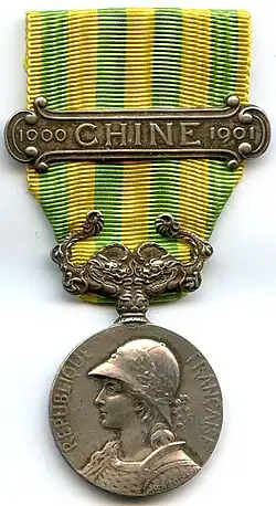 The 1901 China expedition commemorative medal (French: "Médaille commémorative de l'expédition de Chine (1901)") was a French military campaign medal established by the law of 15 April 1902[1] to recognize service in China in 1900 and 1901 during the Boxer Rebellion.