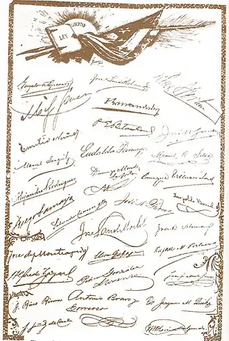 General Leonard Wood, the U.S. military governor of Cuba, called for a constitutional convention to meet in September 1900.[1] It met for the first time on 5 November 1900, in Havana. Wood opened the meeting by charging its thirty-one delegates with writing a constitution and formulating the future relationship between the U.S. and Cuba.[2] Domingo Méndez Capote presided and Enrique Villuendas and Alfredo Zayas served as secretaries.