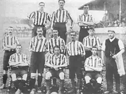 (Back row: C. B. Fry, H. Moger, G. Molyneux. Middle: S. Meston, H. Wood, T. Bowman, A. Chadwick, B. Lee, W. Dawson (trainer). Seated: J. Turner, A. Brown, F. Harrison.)