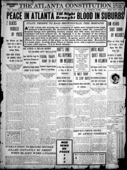 - ^ a b c d "Atlanta Mobs Kills Ten More Negroes; Maybe 25 or 30 – Assaults on Women the Cause; Slain Wherever Found; Cars Stopped in Streets, Victims Torn from Them; Militamen Called Out; Trolley Systems Stopped to Keep the Mob from Reaching the Negro Quarter", New York Times, 23 September 1906