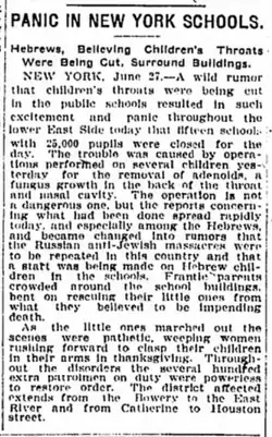The "tonsil riots" of 1906 (also known as the tonsillectomy riots) were public health panics that took place on June 27, 1906, in New York City, concentrated in neighborhoods dominated by Jewish immigrants, that centered on the actions of Board of Health physicians who performed tonsillectomies and adenoidectomies on students at several public schools. The rioters were mostly Jewish mothers who were disturbed by the sight of their children returning home from school exuding blood from the surgeries.[1][2]