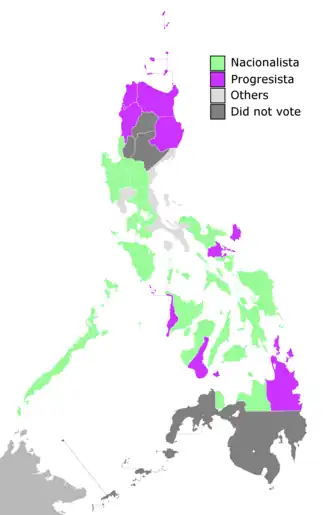 While the Nacionalistas were in disarray, the Progresistas orchestrated a well-organized "popular assembly". The Progresistas established networks on local strongmen on already associated with the Nacionalistas; however, they were only able to field candidates in half of the districts in Central and southwestern Luzon. The Progresistas were unable to recruit supporters even in places were a Progresista is in office, save for Tarlac. In Manila, the Progresistas resorted to encouraging Americans to register and vote for them. However, the Federalistas were able to field in candidates in far-flung areas in Visayas and Mindanao.[7]