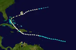 Historical weather maps indicate the presence of a tropical storm about 535 mi (860 km) east-northeast of Barbados on September 7.[1][5] Moving west-northwestward, the storm passed just north of the Lesser Antilles and slowly intensified, becoming a hurricane just offshore the Dominican Republic early on September 11. Thereafter, the cyclone strengthened more quickly, becoming a Category 2 hurricane just prior to striking Inagua in the Bahamas several hours later with winds of 100 mph (160 km/h). Around 12:00 UTC on September 12, the system strengthened into a Category 3 hurricane and peaked with maximum sustained winds of 120 mph (190 km/h) by early the following day. The storm curved northward and passed over or near several islands on September 13 and September 14, including Exuma, Cat Island, and Eleuthera. Later on September 14, the cyclone turned northeastward and exited the island chain. While traversing the open Atlantic, the system slowly weakened and remained a hurricane until falling to tropical storm intensity late on September 18 while just offshore Newfoundland. The storm soon struck the island and became extratropical near Port Rexton. The extratropical remnants continued northeastward and dissipated over the Labrador Sea late the following day.[1]