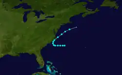 A tropical depression developed on May 24 at 12:00 UTC about 50 mi (80 km) southwest of Cockburn Town, Turks and Caicos Islands. Moving northwestward, the depression struck the Turks and Caicos Islands. Around 06:00 UTC on May 26, the depression intensified into a tropical storm. By late on May 27, the storm curved northeastward. The cyclone strengthened into a hurricane by 06:00 UTC the following day,[1] becoming one of only three May hurricanes in the 20th century, with the others being Able in 1951 and Alma in 1970.[3] The cyclone made landfall west of Cape Hatteras, North Carolina, with winds of 75 mph (120 km/h) around 21:00 UTC on May 29.[1] A few hours later, the cyclone re-emerged into the Atlantic Ocean. Early on May 30, the hurricane weakened to a tropical storm. Accelerating northeastward, the storm struck eastern Long Island, New York, with winds of 40 mph (65 km/h) late on May 30, just prior to making landfall near Noank, Connecticut, at the same intensity around 23:00 UTC. The storm became extratropical over southern Maine early on May 31. The remnants continued northeastward until dissipating over the northern portion of the state several hours later.[1]
