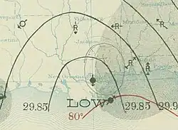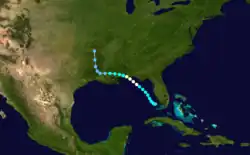 The final storm was first observed as a disturbance near Puerto Rico in the Caribbean Sea in late October.[17] The disturbance was the precursor to a tropical depression which developed over the southern Bahamas and headed west-southwestward across Cuba,[1] where, at Havana, winds blew from the southeast at 44 mph (71 km/h).[17] It became a tropical storm on October 27 and drifted southwestward. Near the eastern tip of the Yucatán Peninsula, the storm turned sharply northward.[1] An area of high pressure over the United States prevented the cyclone from turning eastward toward Florida, and it continued into the Gulf of Mexico. However, on October 31, the storm curved eastward and moved ashore over northern Florida. The storm decreased in intensity as it passed into the Atlantic.[17] The storm's circulation center remained poorly defined throughout its course. It was long believed to have developed south of Cuba, although a reevaluation of ship data indicated the depression had actually formed east of the island.[2] On October 26, the Weather Bureau hoisted hurricane warnings along the east coast of Florida from Key West to West Palm Beach, and on the west coast up to Tampa.[18]