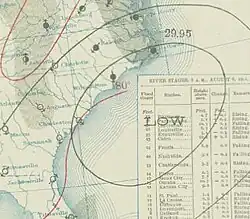 Based on ship observations in the southeastern Gulf of Mexico, a low-pressure area developed north of Key West in early August.[6] It developed into a tropical depression at 12:00 UTC on August 8,[3] and strengthened into a tropical storm at 06:00 UTC on August 9 while moving northwestward off the west coast of Florida.[3] Gradual intensification continued, and at 06:00 UTC on August 11 the storm strengthened to hurricane status.[3] At 22:00 UTC on August 11, the hurricane reached its peak intensity and concurrently made landfall near the border between Alabama and Florida as a small tropical cyclone.[6] During this time, the storm's maximum sustained winds were estimated at 80 mph (130 km/h), making it the equivalent of a Category 1 hurricane on the modern day Saffir–Simpson hurricane wind scale.[3] A lull in the storm accompanied the nearby passage of its eye before conditions once again deteriorated.[7] Although the lowest barometric pressure measured on land was 1007 mbar (hPa; 29.74 inHg) in Pensacola, Florida, the storm's pressure was estimated to be much lower at 982 mbar (hPa: 29.00 inHg).[6] After making landfall, the hurricane weakened and slowly drifted westward, weakening to a tropical depression over Louisiana on August 13, before dissipating over Arkansas by 12:00 UTC the next day.[3]