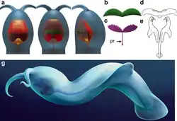 Diagram, showing the arrangements of the jaws and plates in the mouth (a) morphology of the ventral plate (b) and jaws (c) in comparison to equivalent elements of gnathostomulids (d,e) and life restoration (g)