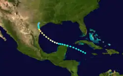 Observations from ships first indicated the presence of a tropical storm to the southeast of the Cayman Islands on October 11.[4] Moving west-northwestward, the storm strengthened steadily, reaching winds of 70 mph (110 km/h) before making landfall near Cancún, Quintana Roo, early on October 13. The system weakened slightly over land and while situated in the Gulf of Mexico just north of the Yucatán Peninsula, but began re-intensifying later that day. By 12:00 UTC on October 14, the cyclone deepened into a Category 1 hurricane and then a Category 2 hurricane about 24 hours later. The hurricane made landfall on central Padre Island between Corpus Christi and Port Mansfield in Texas late on October 16 with winds of 100 mph (155 km/h),[5] estimated based on a storm surge of 6 ft (1.8 m). A barometric pressure of 970 mbar (29 inHg) was estimated using the pressure-wind relationship.[4] The system quickly weakened to a tropical storm early on October 17, several hours before weakening to a tropical depression. The storm dissipated early on October 18.[5]