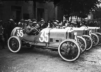 After being driven back to celebrations in Berlin, one of the Mercedes (probably Lautenschlager's) was sent on display in London with two of the Opels.[5] War broke out just afterward, and it was commandeered and turned over to Rolls-Royce where it was carefully pulled apart. The engine was developed and a version ended up in the Bristol fighter planes.[18] American driver Ralph DePalma bought Wagner's car at the race conclusion and took it back to the USA (there is still considerable conjecture and confusion as to which Mercedes chassis ended up in London and the USA[22]). Carl Fisher, on the Indianapolis 500 organising committee, purchased two of the Peugeot EX-5s. When they landed in the United States he handed them over to the Premier Motor Corporation for three replicas to be made.[23]