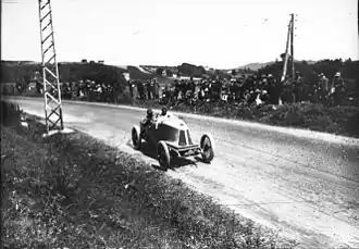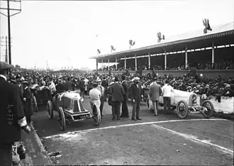 The 1914 French Grand Prix was a Grand Prix motor race held at Lyon on 4 July 1914. Hailed as one of the greatest races of the twentieth century,[1] it was a contest between the French Peugeots and the German Mercedes. For the first time, the Grand Prix was run to an engine limitation – of 4.5L maximum capacity. It was won by the Mercedes of Christian Lautenschlager who won at an average speed of 105.7 km/h (65.7 mph) after a tense seven-hour contest with the Peugeot of Georges Boillot.