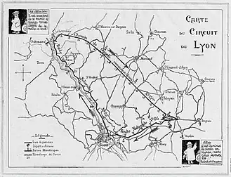 The city of Lyon promised large subsidies to host[3] and the race was held on a 37.6 km road circuit to the south of the city. It ran from Les Ronzières to the town of Givors. It then took the Route Nationale 88 winding along beside the Gier (a tributary of the Rhône) to Châteauneuf. It returned on a long, undulating 12 km (7.5 mi) straight before coming to a steep downhill right-left switchback (nicknamed le piege de la mort – the Death trap) and a hairpin at Les Sept Chemins to complete the lap.[7][8][9] At the end of June the two hairpin turns were concreted and the course was re-laid with granite chips to prevent its break-up and coated with calcium chloride to reduce the dust raised.[9] The Grand Prix was to be twenty laps of the circuit, totalling 752.6 km.