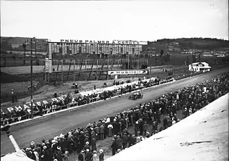 Race-day was hot and fine, and about 300,000 spectators lined the roads. So many were coming out on the trains from the city that many missed the 8am start.[10][9] For the first time, cars were flagged off in pairs at 30-second intervals, in numerical order. First away were Szisz and Jörns,[16][17] but Boillot was the first to arrive back at the finish-line. However, Sailer was ahead on elapsed-time with an 18-second lead and from the beginning he forced the pace, drawing Boillot into a speed-contest.[10][16] Jörns had to stop on the first lap for radiator repairs, dropping his Opel out of the reckoning.[2]
