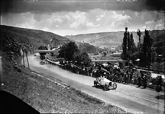 The Peugeots’ stops lost their advantage and the Mercedes’ pursuit was relentless. Although Wagner had to pit on lap 15 to replace tyres, Salzer overtook Goux to move up to fourth.[18] When Boillot then had to pit for tyres on the 17th lap Lautenschlager reduced the lead from 2 minutes to just 14 seconds. He overtook the Peugeot as they approached Givors. Boillot's car had been thrashed to its limits and was now falling apart, down to three cylinders. By the end of the 18th lap he was 30 seconds behind.[18][9] Boillot kept pushing regardless but on the last lap his engine finally expired when he over-revved it on the climb out of the Gier valley. Boillot was distraught, hunched over the steering wheel weeping at his failure.[18][9]