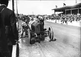 But despite that, Boillot's skill and all-or-nothing driving kept him with a 2-3 minute lead. By the 11th lap with the pitstops done, Wagner had passed Goux and Lautenschlager to move into second.[11] Then a dangerous accident happened. Szisz had pulled over on the roadside to change a wheel, when he was struck by Breckheimer's Opel when it was obscured by the dust. His arm broken, it fell to his less injured mechanic to slowly get the car back to the pits where Szisz could get attention.[9][19][14]