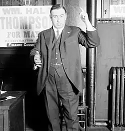 Thompson worked hard to seek strong support from the African American community.[11] He also courted the city's German population, giving strong praise to Germans and their culture, and dismissing reports of atrocities being committed by the German forces in the German occupation of Belgium as British propaganda.[6] This would prelude the neutral stance on World War I and the evocation of anglophobia that would become notable characteristics of Thompson's political career.[6][13]