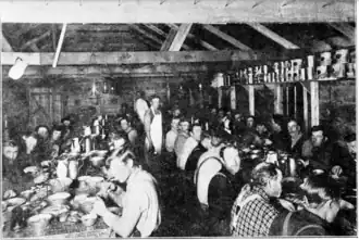 As an industrial union—as opposed to a craft union—the IWW sought to organize all workers in the area's lumber industry, which would include both the mill workers and the lumberjacks.[4] Lumberjacks in northern Minnesota worked in poor conditions and during their employment lived in company-owned bunkhouses on logging camps.[13] The typical bunkhouse measured 80 feet (24 m) by 30 feet (9.1 m) in area and housed between 60 and 90 men.[13] Lumberjacks shared beds in these close quarters, which were often lice-infested, and in 1914, investigators for Minnesota's Department of Labor reported that "the conditions under which the men were housed ... made it impossible for men to keep their bodies free from vermin".[13] Additionally, the houses were poorly ventilated and insulated, toilet facilities at the camps were often extremely primitive, and there were no first aid facilities despite the high injury rate among lumberjacks.[14] In 1914, two state investigators stated in a report after visiting a camp, "Both of us regretted that we did not have the authority to order all the men out of the camp and burn the place to the ground".[15] Men worked six- or seven-day weeks at the camps,[note 2] though their isolation from many nearby towns meant that they often remained at their camps even on their days off, and the typical lumber season lasted between 3 and 6 months.[15] Many earned between $35 and $40 per month[16] (equivalent to between $1,011 and $1,156 in 2024[11]). These camps had an extremely high turnover rate, with the Virginia and Rainy Lake Lumber Company employing a total of 22,000 people in lumberjack positions in 1916, but only ever having about 2,000 employed at one time.[15] The average worker left after 74 days, resulting in an entirely new crew about once every month for many camps.[15] Additionally, lumberjacks were often looked down upon by town residents and other members of society, who derogatorily called them "timber beasts".[15] Lumberjacks were drawn to the IWW as a way to improve both their working conditions and stance in society.[15] In many of the towns in northern Minnesota, lumberjacks were welcomed in IWW halls, where they could sleep, socialize, and discuss organizing plans with others.[15]