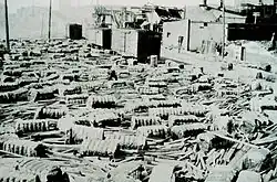 Shipping interests in Mobile Bay suffered extensively, with numerous vessels, including small boats, large yachts, schooners, and steamships, being sunk or driven aground.[7] Fifteen barges in the bay were destroyed and a similar number of sailing ships sank or sustained substantial damage.[17] In one case, a floating dry dock carrying a tugboat was deposited on the municipal docks.[28] Damage to ships was generally worsened by their owners' complacency stemming from the widespread belief that it was too early in the season for severe hurricanes.[7] In the southern part of the bay, several vessels foundered—among them the schooners Emma Lord and J. C. Smith and the barge Harry T. Morse—resulting in the deaths of about a dozen people.[7][29] Overall damage in Mobile was estimated at $2–3 million, and four drowning deaths were reported in and around the city. To the south, the storm produced severe property damage in Fort Morgan.[7]