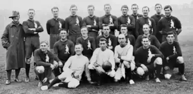 Two hand-stitched footballs were made for the match by Corporal C.C. McMullen,[15][47] who had been a leatherworker at Henry Fordham's football factory in Sydney Road, Brunswick,[48] prior to his enlistment in the First AIF. The Fordham footballs — i.e., contrasted with the "Sherrin" footballs (see the football held by Dan Minogue in the image above) that had been (c.1902) especially designed to facilitate the stab-kicking of the Collingwood footballers[49] — were being used in the West Australian Goldfields League as early as 1907.[50] Also, Fordham footballs were the official ball for the Victorian Football Association (VFA) for fourteen years in the 1920s and 1930s.[51]