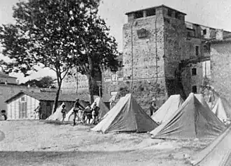 4,174 people were displaced between Rimini and Riccione.[8][16] Several families took residence in empty seaside villas.[3][23] The municipal engineers housed people in bathing huts, and decided to build barracks near damaged homes rather than in a large, central camp.[8] Il Resto del Carlino reported on 19 August that pavilions with a capacity for 70 people each were built, alongside 35 wooden barracks, 6 timber wagons, and over 2,000 tents.[6] 882 shelters were granted, and many residents began to repair their own homes. As people moved to less-affected localities, malaria spread.[8]