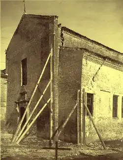 80% of Riccione was razed.[4] Among the destroyed buildings were the ancient Church of San Lorenzo in Strada and the Ceccarini kindergarten, which were rebuilt, and the Amanti-Martinelli Marine Hospice, which was replaced with the Grand Hotel. Damaged buildings included the Ceccarini Hospital, the Hotel des Bains, the Villa Graziani, the Villa Pullè, and the Fontanelle and Trinità towers.[4][23] Engineers noted that the Hotel des Bains had insufficiently thick walls for its height, and that buildings in the Fontanelle area had been shoddily built using rounded pebbles bound with low-quality lime.[8]