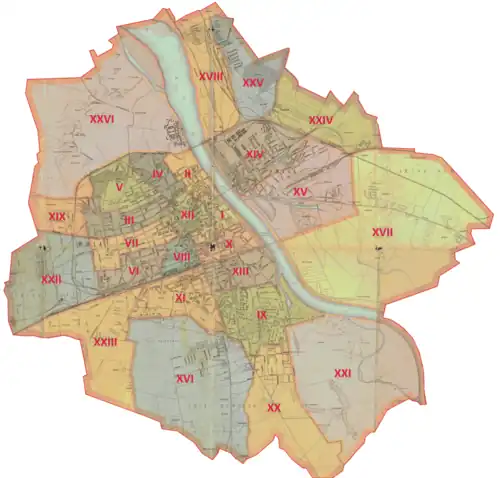 The city was divided into 52 electoral districts.[10] The 2,345 registered voters of the Third Curia were not divided into electoral districts.