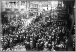 During the strike, the actors used a number of techniques to reach the people and pressure the managers. Not only did thousands of players walk out, but they also picketed the closed theaters. In New York, hundreds of Equity members could be found outside closed theaters every night waving banners and delivering speeches about the injustices committed by the managers. The strikers consistently spoke to the press and held parades in order to cultivate public support.[24] One of the most famous parades occurred on Wall Street; it consisted of fifteen cars full of well-dressed, leading actresses driven by prominent actors. Strikers' banners read "No More Pay, Just Fair Play."[4] Bystanders cheered the actors and actresses on.[25]