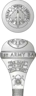 The drum major's mace shows, on the dome, the distinctive unit insignia of the 63rd Readiness Division. Displayed around the mace is the inscription "191st ARMY BAND". On the lower portion and on both sides of the mace are three scrolls bearing the inscription "THE BAND" "OF THE" "WILD WEST"; below is the image of crossed miner's picks and pan, used by the miner's during the California Gold Rush, alluding to the unit's home station of California. A stylized rope encircles the bottom of the mace six times, suggesting a lariat, a symbol of the Wild West.[5]