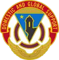 The Distinctive Unit Insignia is a enamel pin with a down pointing blue triangle with a small gold star and the Elm Morro fortress in it. Below the triangle is a segmented circle in brick red. Below the circle is a pair of golden wings. Above the triangle is a soldier red scroll with the motto "Domestic and Global Support."[3]