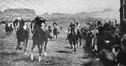 The Derby was run on an unusually hot day in front of an estimated crowd of 250,000 including the King and Queen.[2] Spion Kop started at odd of 100/6 (approximately 16/1) in a field of 19 runners. The favourite was the 2000 Guineas winner Tetratema a colt noted for his exceptional early speed but with dubious stamina.[3] Tetratema went into an early lead and set an extremely fast pace as he was challenged by Abbot's Trace (ridden by Steve Donoghue),[4] while O’Neill settled Spion Kop well back in the field. Tetratema dropped back soon after half way and Abbot's Trace led into the straight as Spion Kop made rapid progress from the rear. Spion Kop took the lead three furlongs from the finish and ran on strongly up the straight to win by two lengths from Archaic and Orpheus in a new race record time of 2:34.8. The most dramatic incident of the race occurred in the closing stages when Abbot's Trace was brought down in a collision with Sarchedon, who finished fourth.[4]