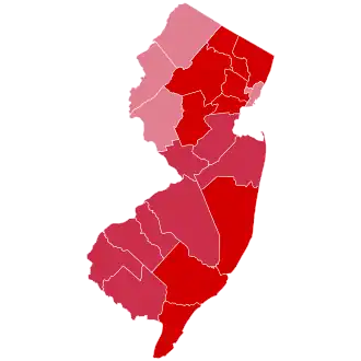 Harding carried New Jersey overwhelmingly with 67.65 percent of the vote to Cox's 28.42 percent, a victory margin of 39.23%.[2] This is the highest popular vote percentage ever recorded by any candidate in New Jersey.[3] On the county level map, reflecting the decisiveness of his victory, Harding became the first presidential nominee to sweep all 21 of New Jersey's counties, a feat later accomplished only by Dwight D. Eisenhower in 1956, Lyndon B. Johnson in 1964 and Richard Nixon in 1972.[3]